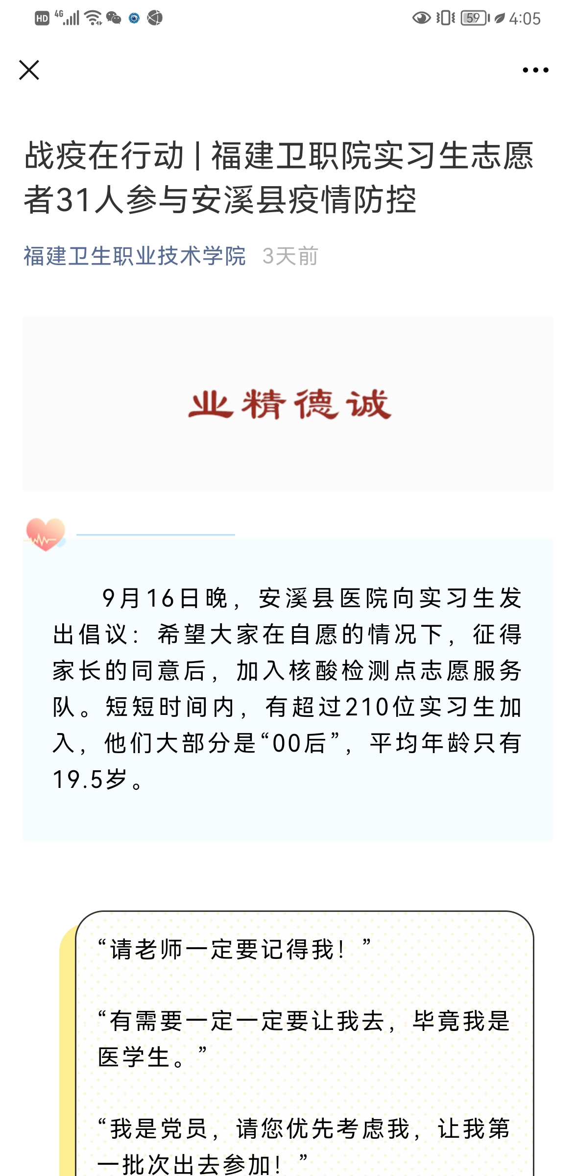 為進(jìn)一步引導(dǎo)未來(lái)的醫(yī)藥衛(wèi)生工作者正確面對(duì)疫情,積極號(hào)召同學(xué)們學(xué)習(xí)白衣天使們“疫”往無(wú)前,勇于擔(dān)當(dāng)?shù)木?。全校輔導(dǎo)員積極了解廣大實(shí)習(xí)生和畢業(yè)校友參加抗“疫”的故事和先進(jìn)事跡,依托校院兩級(jí)新媒體平臺(tái)廣泛宣傳,不斷堅(jiān)定青年學(xué)子的信心,進(jìn)一步弘揚(yáng)愛(ài)國(guó)奮斗精神,引導(dǎo)學(xué)生把“小我”融入“大我”,勤奮學(xué)習(xí),刻苦鉆研,上好疫情防控這堂思想政治大課。