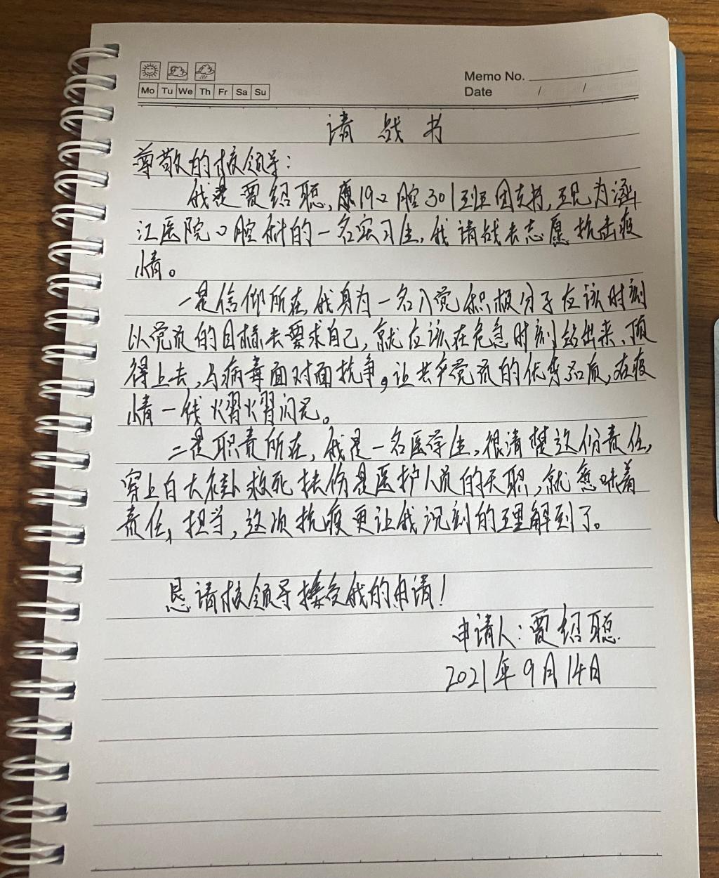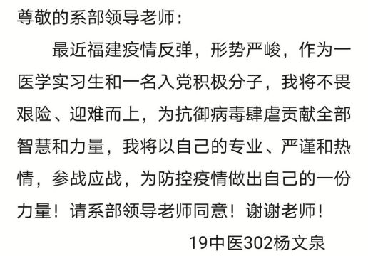 作為兩委干部,在校期間帶領(lǐng)著青年志愿者們走進(jìn)社區(qū)、福利院、養(yǎng)老院參加各項公益服務(wù),在疫情面前,毅然沖鋒在前,駐守在安溪縣城廂鎮(zhèn)仙苑村第五小學(xué)臨時核酸采樣點,將志愿服務(wù)進(jìn)行到底。“尊敬的領(lǐng)導(dǎo)、老師,作為一名醫(yī)學(xué)生,更是一名入黨積極分子,我將不畏艱險、迎難而上,為抗御病毒肆虐貢獻(xiàn)全部智慧和力量!”