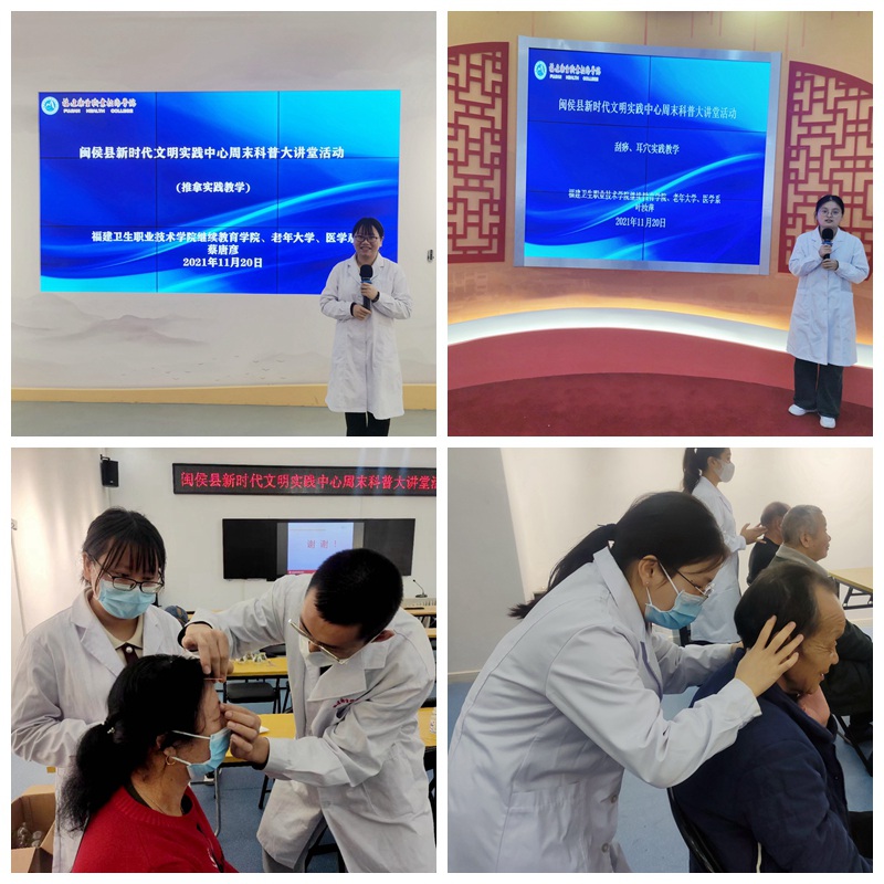 開班結(jié)束后,陳銘為學(xué)員們帶來周末科普大講堂第一課——常見穴位與保健推拿。通俗易懂、簡便易學(xué)的內(nèi)容,幫助學(xué)員們了解日常穴位與保健推拿對老年人健康與長壽的重要性,使學(xué)員們正確認(rèn)識健康養(yǎng)生方法。醫(yī)學(xué)系教師葉汝萍、蔡唐彥為學(xué)員們帶來刮痧、耳穴、推拿等實踐課程,并組織學(xué)生為在場的老年學(xué)員們進行義診服務(wù)。授課現(xiàn)場氛圍熱烈,學(xué)員們對我校老年大學(xué)的課程設(shè)置給與一致好評,期待我校老年大學(xué)帶來更多實用有趣的課程內(nèi)容。