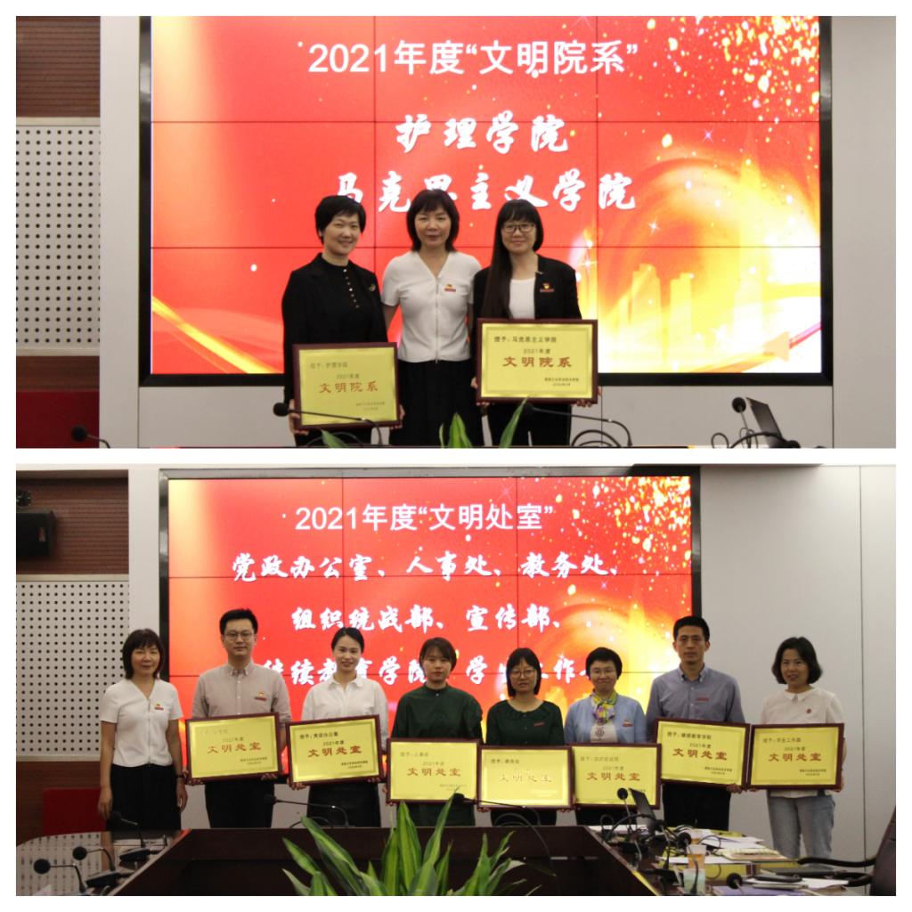 為營造文明建設的良好氛圍,大會對獲得2021年度“文明院系”和“文明處室”的單位進行了表彰。2021年度,護理學院、馬克思主義學院獲得“文明院系”榮譽稱號,黨政辦公室、人事處、教務處、組織統(tǒng)戰(zhàn)部、宣傳部、繼續(xù)教育學院、學生工作部獲得“文明處室”榮譽稱號。李美華為受表彰的文明院系、處室頒發(fā)了獎牌。