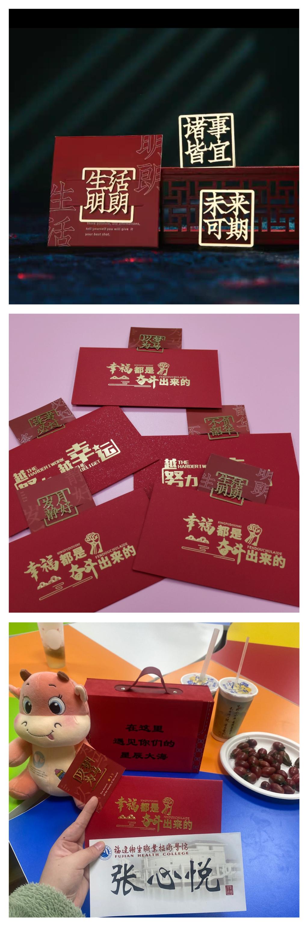 漸入有年數(shù),喜逢新歲來(lái)?!凹t包”是中國(guó)人春節(jié)親人間彼此的守護(hù)和關(guān)懷,也飽含了長(zhǎng)輩對(duì)晚輩深深的祝福。臨近2022年底,座談會(huì)最后,曾武祈代表閩衛(wèi)院“家長(zhǎng)們”為學(xué)生代表送上了美好寓意的“紅包”,以“簽”祝學(xué)子,遙送學(xué)生家長(zhǎng)。希望學(xué)子們?cè)陂}衛(wèi)大家庭里以夢(mèng)為馬,生活明朗,遇見(jiàn)自己的星辰大海,終不負(fù)韶華,平生歡喜。