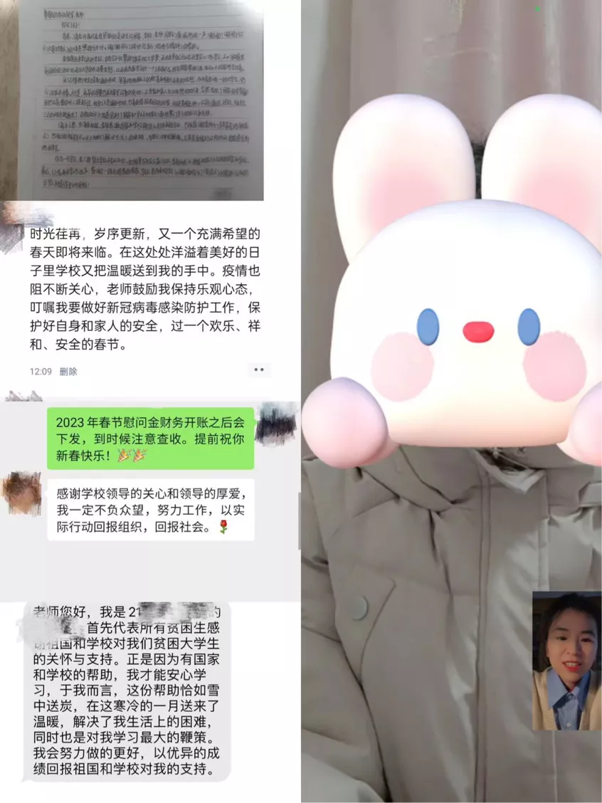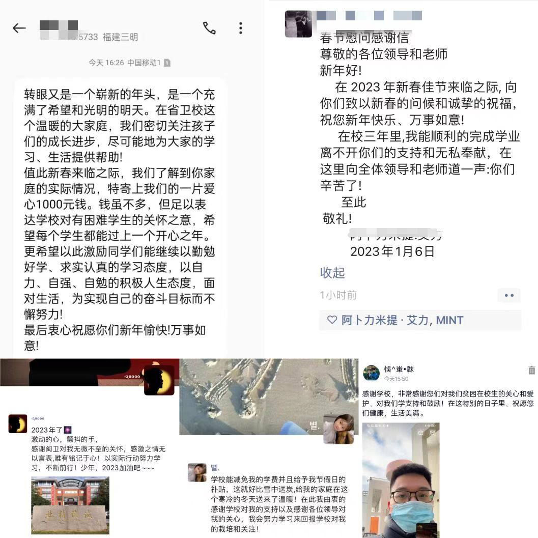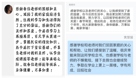 慰問(wèn)結(jié)束后,同學(xué)們紛紛發(fā)來(lái)感謝短信,感激國(guó)家資助政策的支持,感謝學(xué)校和老師的溫暖關(guān)懷,表示未來(lái)將再接再厲、踔厲奮發(fā)、學(xué)有所成,報(bào)答學(xué)校和老師的殷切栽培,并向老師們送上了新春祝福。