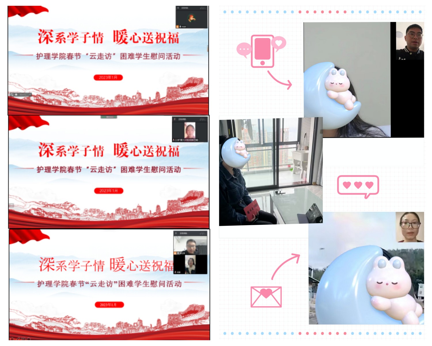 為進(jìn)一步扎實(shí)推進(jìn)高校資助育人工作,在疫情特殊時(shí)期切實(shí)關(guān)心關(guān)愛(ài)困難學(xué)生,我校以線(xiàn)上微信視頻、電話(huà)等方式開(kāi)展了春節(jié)“云走訪”困難學(xué)生慰問(wèn)活動(dòng),向她們送去學(xué)校的溫暖問(wèn)候和春節(jié)祝福。