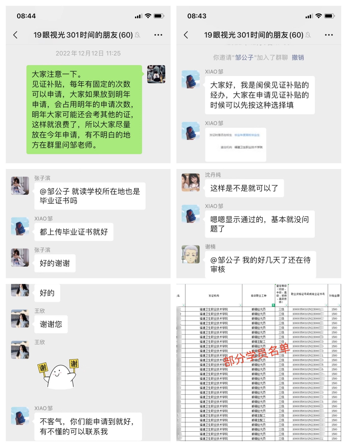 據(jù)悉,以往應(yīng)屆畢業(yè)生“見證補貼”資金申領(lǐng)需前往戶籍所在地人社局申請,且各地補貼資金申領(lǐng)政策差異較大、申請程序繁瑣等原因大大降低了學(xué)生的申請意愿。我校在了解情況后,由繼續(xù)教育學(xué)院聯(lián)合醫(yī)學(xué)技術(shù)系成立眼視光專業(yè)學(xué)生“見證補貼”工作專班,創(chuàng)建微信服務(wù)工作群,并邀請閩侯縣人社局審核專員入群指導(dǎo)。針對學(xué)生提出的各項問題閩侯縣人社局給予了悉心指導(dǎo),解決學(xué)生在證書補貼申領(lǐng)流程上的諸多疑問,大大提升了申領(lǐng)效率,打通證書補貼資金申領(lǐng)“最后一公里”。截至目前,我校共有126名學(xué)生成功申領(lǐng)補貼,三級證書(高級)每人可領(lǐng)取補貼1500元,合計補助金額189000元。