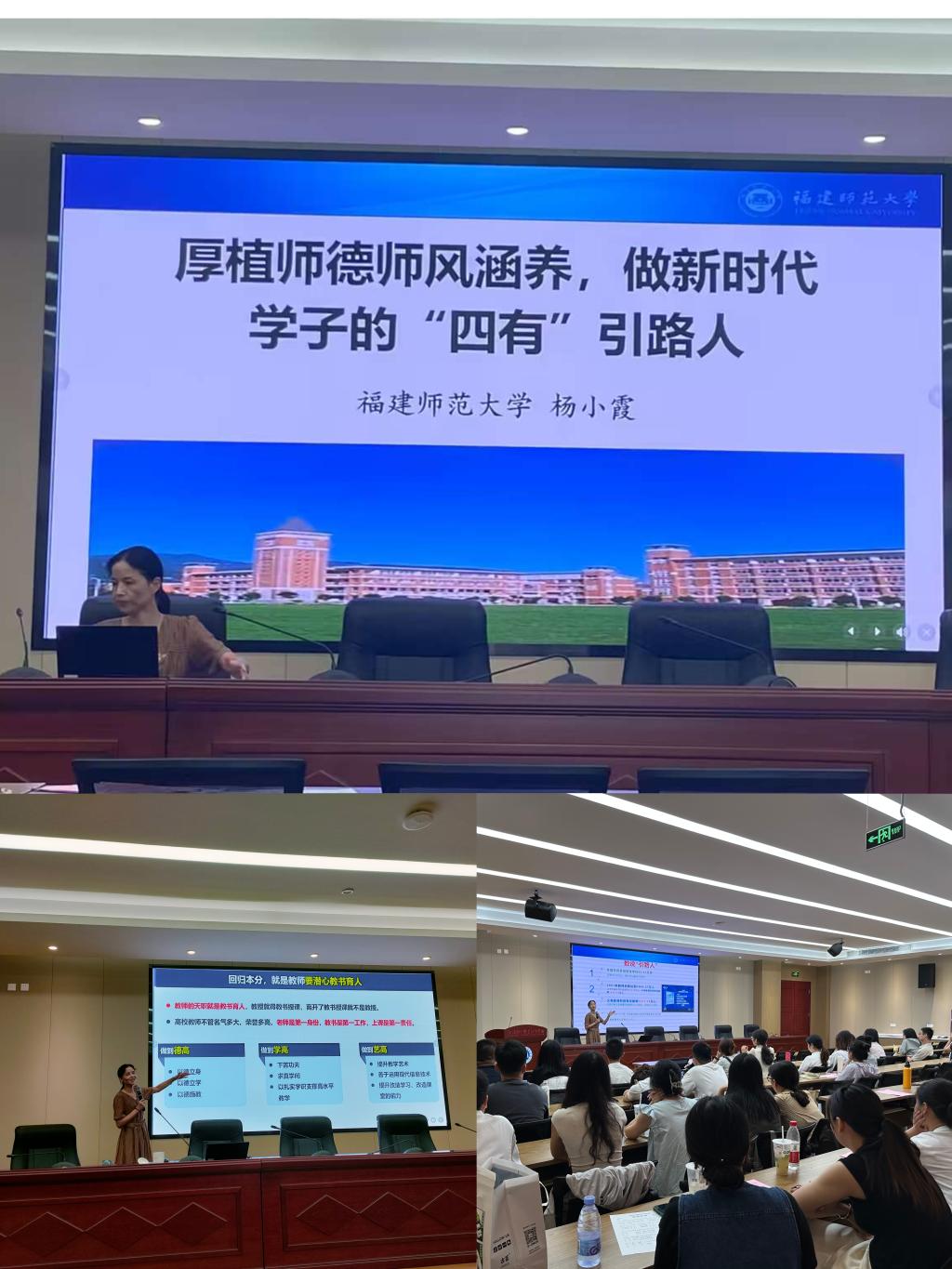 福建師范大學(xué)楊小霞教授則圍繞“師德師風(fēng)”為新入職教職工作題為《厚植師風(fēng)師德涵養(yǎng),做新時代學(xué)子的“四有”引路人》專題講座。講座中,楊小霞教授提出,教書育人,教書者必先學(xué)為人師,育人者必先行為世范,并引用習(xí)近平總書記的重要講話,勉勵老師要做學(xué)生錘煉品格的引路人,學(xué)生學(xué)習(xí)知識的引路人,學(xué)生創(chuàng)新思維的引路人,學(xué)生奉獻祖國的引路人。她激勵教師們要提高自我思想修養(yǎng),自覺遵守學(xué)校的規(guī)章制度和有關(guān)規(guī)定,以身作則,潔身自好,以德服人,以身立教,為學(xué)生樹立起楷模的形象,做一名合格的新時代教師。
