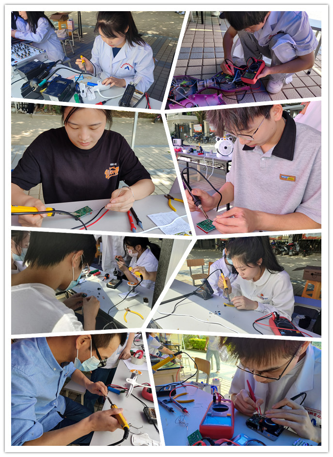 活動現(xiàn)場,工作人員積極向同學(xué)們科普科技小知識,帶領(lǐng)同學(xué)們參觀各個活動區(qū)域并介紹各區(qū)域的分工;利用平時學(xué)到的專業(yè)知識,對同學(xué)們送來的故障小電器進行現(xiàn)場檢測和維修。他們專注的模樣也吸引了過往師生駐足旁觀,有的甚至申請親自動手嘗試,感受焊接的魅力。參加維修活動的同學(xué)互相配合、學(xué)習(xí)探討,每修好一件電器,大家都非常開心,在求知與實踐中收獲了滿滿的快樂與成就感。