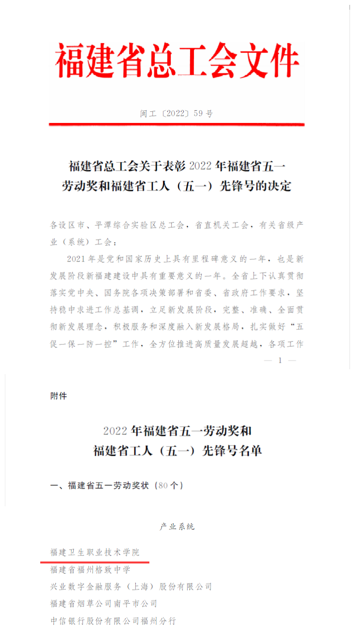 近日,福建省總工會印發(fā)《關(guān)于表彰2022年福建省五一勞動獎和福建省工人(五一)先鋒號的決定》,我校榮獲福建省五一勞動獎狀,是福建省唯一獲此殊榮的高校,也是唯一一所職業(yè)院校。