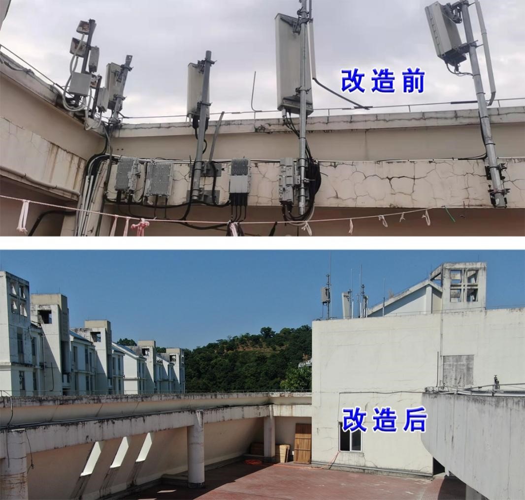 拆除并優(yōu)化明湖餐廳4樓等場所的運營商基站抱桿,消除管線“蜘蛛網(wǎng)”等視覺污染,校園環(huán)境更加清爽整潔。
