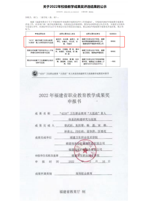 以支部黨員為主要成員申報(bào)的教學(xué)成果--《“4235”衛(wèi)生職業(yè)教育“大思政”育人體系的構(gòu)建研究與實(shí)踐》獲得校特等獎(jiǎng),送交進(jìn)行福建省職業(yè)教育教學(xué)成果獎(jiǎng)的申報(bào)。(附件8)