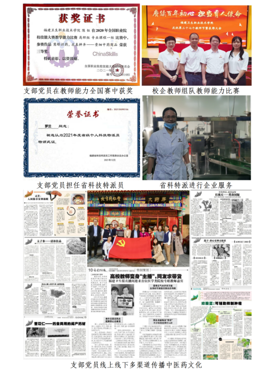 藥學(xué)院第一黨支部堅(jiān)持面向人人、服務(wù)社會(huì)。校企黨支部共建福建省藥師協(xié)會(huì)執(zhí)業(yè)藥師繼續(xù)教育面授施教機(jī)構(gòu)、職工培訓(xùn)中心等職業(yè)培訓(xùn)平臺(tái),在為產(chǎn)業(yè)發(fā)展提供優(yōu)質(zhì)培訓(xùn)的同時(shí),豐富校企師資的培訓(xùn)經(jīng)驗(yàn),提升校企師資的技能水平。校方發(fā)揮在專業(yè)理論與實(shí)驗(yàn)技術(shù)方面的優(yōu)勢(shì),為福建衛(wèi)生報(bào)撰寫(xiě)“福九味”科普文章9篇;支部黨員通過(guò)省級(jí)科技特派員方式深入鄉(xiāng)鎮(zhèn),對(duì)小微企業(yè)采取現(xiàn)場(chǎng)調(diào)研、面對(duì)面交流、零距離指導(dǎo)、點(diǎn)對(duì)點(diǎn)答疑方式,送科技服務(wù)上門(mén);為咸康藥業(yè)有限公司等中藥生產(chǎn)企業(yè)提供培訓(xùn),提高質(zhì)檢人員的中藥粉末顯微鑒定技能;為北京同仁堂門(mén)店提供培訓(xùn),提高員工鑒別貴細(xì)中藥真?zhèn)蝺?yōu)劣的技能。校企雙方共同打造培訓(xùn)課程,提供優(yōu)質(zhì)培訓(xùn),共同開(kāi)展2021、2022年執(zhí)業(yè)藥師繼續(xù)教育培訓(xùn)工作,對(duì)接市場(chǎng)需求,推動(dòng)培訓(xùn)質(zhì)量不斷提升。2022年1月,福建省中藥傳統(tǒng)技能競(jìng)賽由藥學(xué)院承辦,第一黨支部中藥教研室所有黨員教師擔(dān)任中藥傳統(tǒng)技能競(jìng)賽場(chǎng)地的技術(shù)負(fù)責(zé)人。同時(shí),福建瑞來(lái)春健康管理有限公司也為比賽提供了400種優(yōu)質(zhì)優(yōu)價(jià)的中藥品種,保證比賽的順利進(jìn)行。