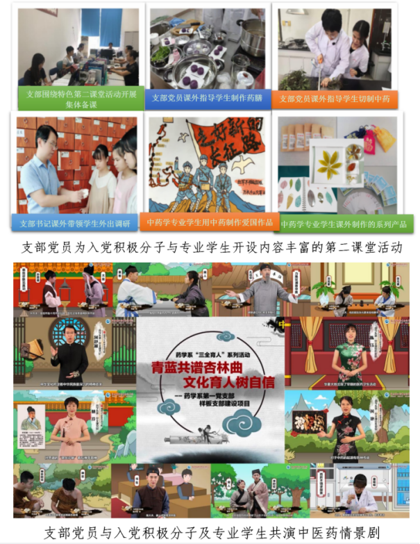 通過(guò)校企間黨建的緊密合作,支部將“黨建帶動(dòng)中藥學(xué)專業(yè)發(fā)展”落到實(shí)處,面向?qū)W生、企業(yè)員工,制定特色人培方案,因材施教,精準(zhǔn)培養(yǎng)。近3年,獲評(píng)省級(jí)樣板支部培育創(chuàng)建單位、省級(jí)“雙帶頭人”支部書(shū)記工作室培育建設(shè)單位、省級(jí)先進(jìn)基層黨組織,校級(jí)五星級(jí)黨支部、校級(jí)先進(jìn)黨支部,支部黨員獲評(píng)校級(jí)優(yōu)秀共產(chǎn)黨員3人、優(yōu)秀黨務(wù)工作者1人、三育人先進(jìn)工作者1人。(附件1,2)