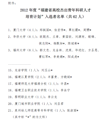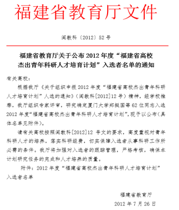 1.2012年入選“福建省高等學校杰出青年科研人才培育計劃”