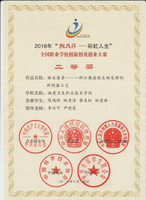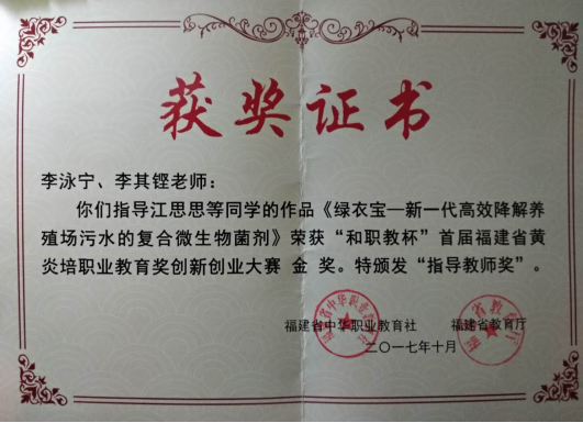 此外,在全國高校積極響應國家“大眾創(chuàng)業(yè)、萬眾創(chuàng)新”的號召和推進高等學校創(chuàng)新創(chuàng)業(yè)教育和大學生自主創(chuàng)業(yè)工作的等文件精神指導下,李泳寧在校院領導的支持下,以學院實踐教學基地建設為平臺促進學生創(chuàng)新創(chuàng)業(yè)活動,按“創(chuàng)新意識培養(yǎng)+創(chuàng)新實踐試點”的培養(yǎng)思路,以“專業(yè)教師+學生”的培養(yǎng)模式,全程跟進學生創(chuàng)新創(chuàng)業(yè)實踐活動,構建“師徒式”創(chuàng)新創(chuàng)業(yè)體系,取得良好成效。2017年初,李泳寧以校企科研合作項目“高效降解養(yǎng)殖場污水的復合微生物菌劑的研制及應用”為切入點,指導了江思思等5同學組成創(chuàng)新創(chuàng)業(yè)團隊參與了該項目的技術研究,經(jīng)過一次次的菌種培養(yǎng)、篩選、試驗、測評,篩選獲得了耐受能力強、降解效率高的地衣芽孢桿菌和硝化細菌。之后,帶領學生創(chuàng)新團隊在生豬養(yǎng)殖場臭氣熏天的污水處理池進行了長達5個月的現(xiàn)場調試試驗,學生創(chuàng)新團隊開發(fā)的新一代高效降解養(yǎng)殖場污水的復合微生物菌劑在養(yǎng)殖場污水處理中,不僅縮短了污水中污染物的降解周期,養(yǎng)殖污水各指標也優(yōu)于國家排放標準。2017年10月,在福建省首屆面向職業(yè)院校的創(chuàng)新創(chuàng)業(yè)賽事“和職教杯”首屆福建省黃炎培職業(yè)教育獎創(chuàng)新創(chuàng)業(yè)大賽中,學生創(chuàng)新團隊作品“綠衣寶—新一代高效降解養(yǎng)殖場污水的復合微生物菌劑”項目榮獲福建省黃炎培職業(yè)教育獎創(chuàng)新創(chuàng)業(yè)大賽高職組金獎,李泳寧獲指導教師獎,這是學校開展創(chuàng)新創(chuàng)業(yè)教育和實踐活動以來首次獲得的榮譽,為其他各項創(chuàng)新創(chuàng)業(yè)活動的開展奠定了良好的基礎。2018年6月,李泳寧指導學生參加 “挑戰(zhàn)杯——彩虹人生”創(chuàng)新創(chuàng)效創(chuàng)業(yè)大賽獲省賽一等獎和全國二等獎;2021年5月指導學生參加第十五屆“挑戰(zhàn)杯”福建省大學生課外學術科技作品競賽獲得三等獎;2021年7月指導學生參加第七屆福建省“互聯(lián)網(wǎng)+”大學生創(chuàng)新創(chuàng)業(yè)大賽獲得銅獎。眾多獎勵的背后是他無數(shù)個日日夜夜指導學生、加班加點、無私奉獻的成果。