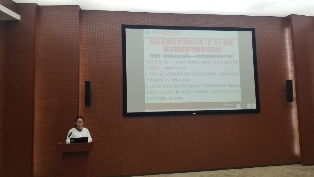 參觀結束后,全體中心組成員在博物館多功能廳召開黨總支理論學習中心組(擴大)會議暨主題教育專題學習研討,醫(yī)學院黨總支書記邱滾忠主持會議。與會人員圍繞主題教育專題五:廉潔奉公樹立新風——持之以恒推進全面從嚴治黨進行集中學習研討。醫(yī)學院副院長鄧元榮、副書記陳潔結合專題學習進行交流分享。