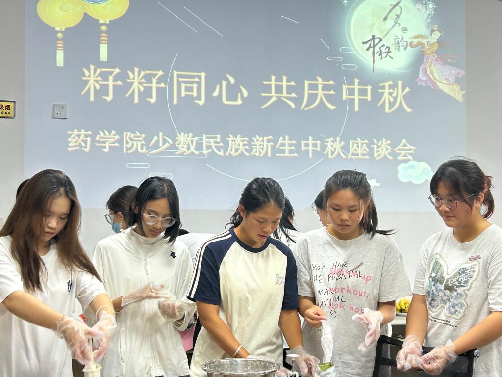 座談會(huì)前,少數(shù)民族學(xué)生同藥學(xué)院團(tuán)學(xué)干部們一起制作月餅,感受指尖帶來(lái)的節(jié)日歡愉,并收獲親手制作傳統(tǒng)美食的欣喜。