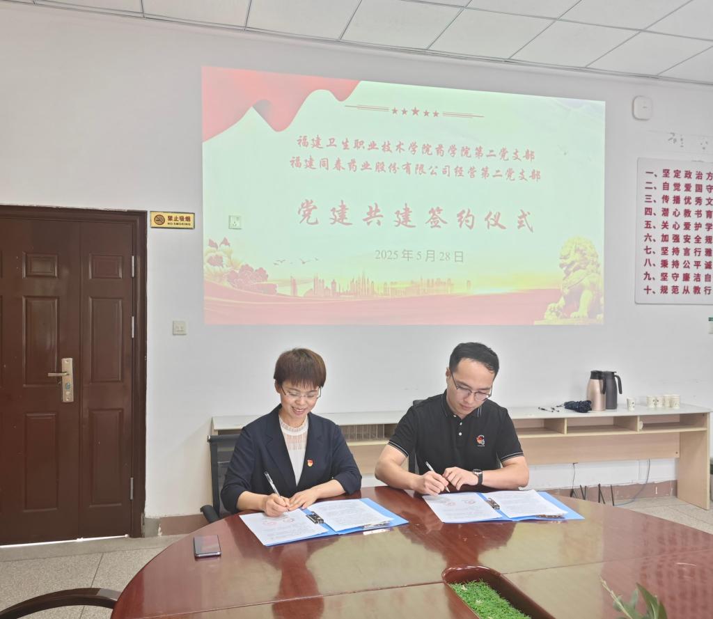 藥學(xué)院第二黨支部與福建同春藥業(yè)股份有限公司經(jīng)營(yíng)第二黨支部舉行支部共建簽約儀式。雙方代表以座談會(huì)的形式分別介紹了各自黨支部基本情況,圍繞以黨建為紐帶、發(fā)揮各自優(yōu)勢(shì)、加強(qiáng)資源共享,就聚焦人才培養(yǎng)、實(shí)習(xí)就業(yè)等領(lǐng)域深化合作展開(kāi)探討。