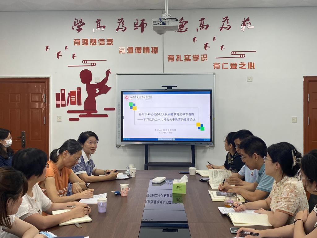 根據(jù)學習貫徹習近平新時代中國特色社會主義思想主題教育工作安排,6月8日下午,副校長朱扶蓉以《新時代新征程辦好人民滿意教育的根本遵循——學習黨的二十大報告關于教育的重要論述》為題,為護理學院全體教職工講黨課。校主題教育協(xié)調(diào)推進六小組成員林燕、黃玲云參加本次黨課,護理學院黨總支副書記林來元主持。