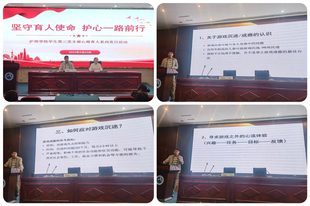 五月,是青春的季節(jié),也是成長(zhǎng)的季節(jié)。在這個(gè)充滿活力與希望的月份里,護(hù)理學(xué)院學(xué)生第三黨支部聯(lián)合護(hù)理學(xué)院護(hù)心苑精心策劃并舉辦了心理育人系列黨日活動(dòng),旨在通過專家講座和多彩活動(dòng),為學(xué)生提供心理支持和幫助,引導(dǎo)他們健康成長(zhǎng)。本次系列活動(dòng)不僅邀請(qǐng)了三位心理學(xué)領(lǐng)域?qū)<遥€精心策劃了多項(xiàng)富有創(chuàng)意的實(shí)踐活動(dòng),旨在通過理論與實(shí)踐相結(jié)合的方式,為學(xué)生們提供全面而深入的心理健康教育。