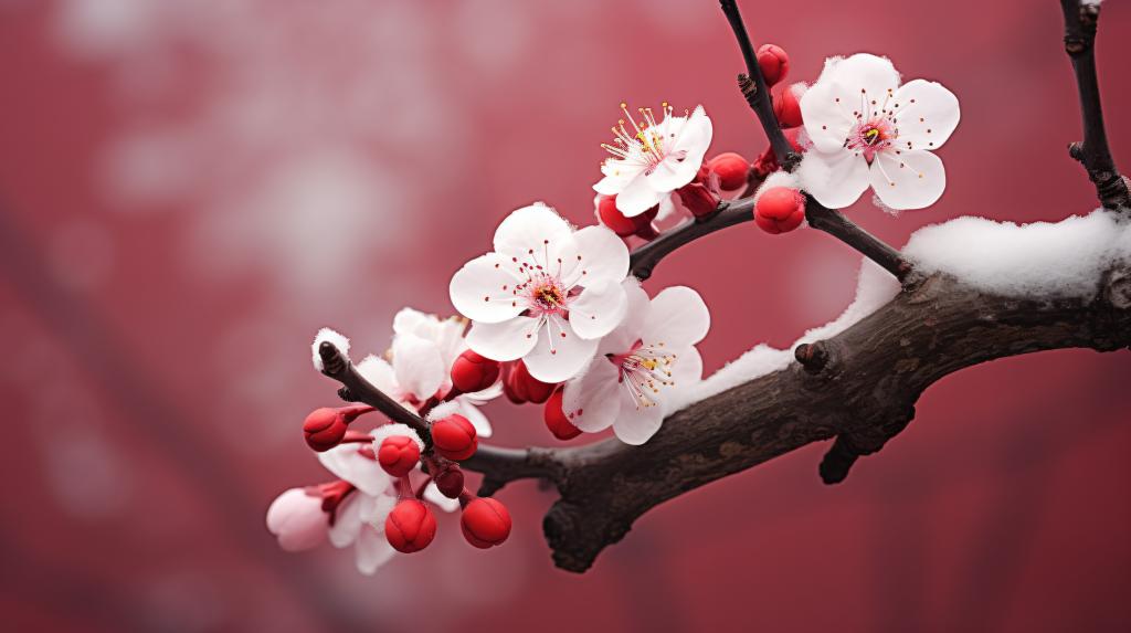 詩的開篇“雪入春分省見稀”,點(diǎn)明時(shí)間是春分之后,且強(qiáng)調(diào)此時(shí)下雪是比較罕見的現(xiàn)象。春分本應(yīng)是春暖花開、萬物復(fù)蘇的時(shí)節(jié),然而一場春雪卻突然降臨,這種意外打破了人們對春日常規(guī)景象的認(rèn)知,為全詩增添了一份新奇之感?!鞍腴_桃李不勝威”,描繪了半開的桃李花在春雪的侵襲下顯得嬌弱不堪的情景。桃李本是春天的使者,它們帶著春天的希望與生機(jī),卻在這場春雪中受到了考驗(yàn)。但換個(gè)角度看,這也體現(xiàn)出大自然的變幻莫測,即便是在看似溫暖的春天,也會(huì)有寒冷的挑戰(zhàn)。