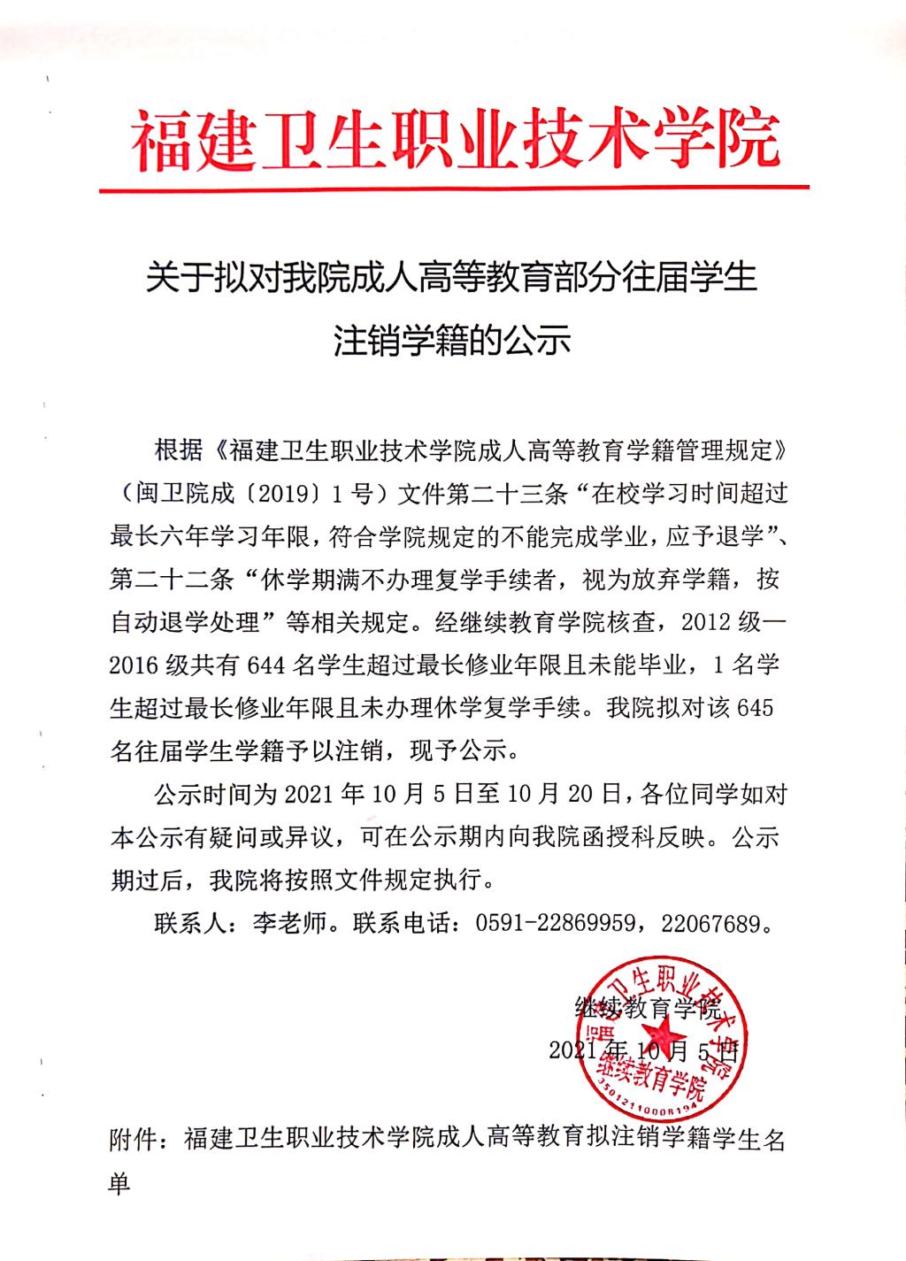 關(guān)于擬對(duì)我院成人高等教育部分往屆學(xué)生注銷學(xué)籍的公示
