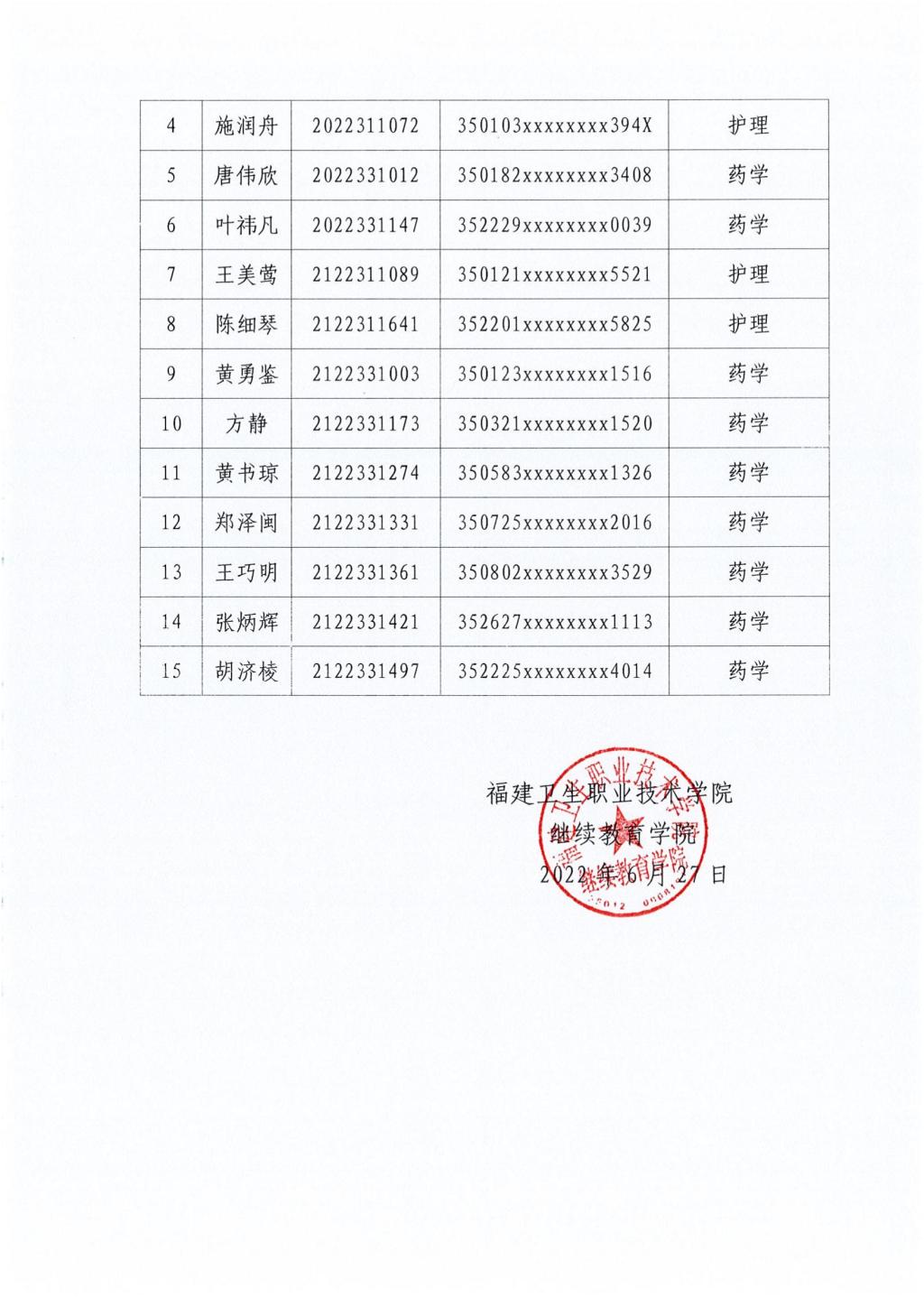 關于給予2022年福建衛(wèi)生職業(yè)技術學院高等學歷繼續(xù)教育張際林等15名學生自動退學處理的公示