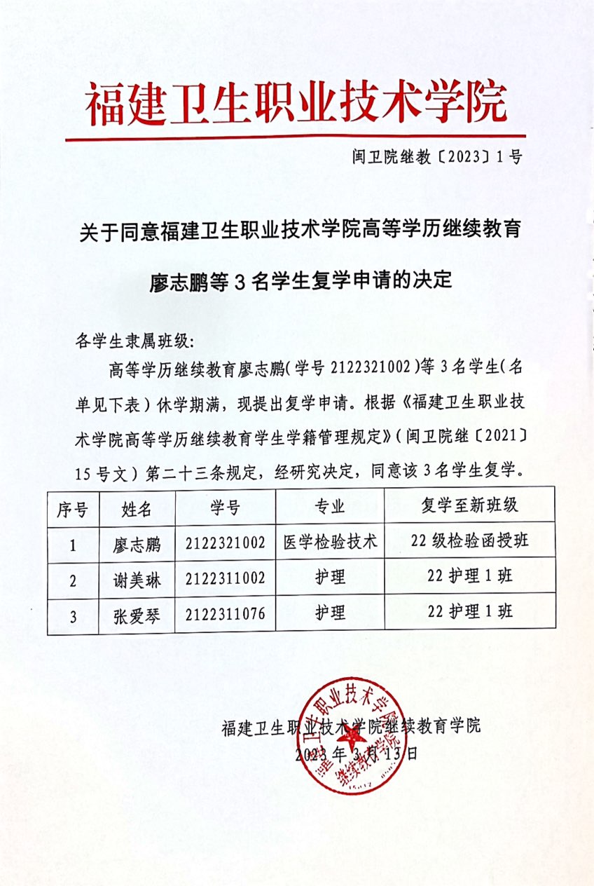 關(guān)于同意福建衛(wèi)生職業(yè)技術(shù)學(xué)院高等學(xué)歷繼續(xù)教育廖志鵬等3名學(xué)生復(fù)學(xué)申請的決定