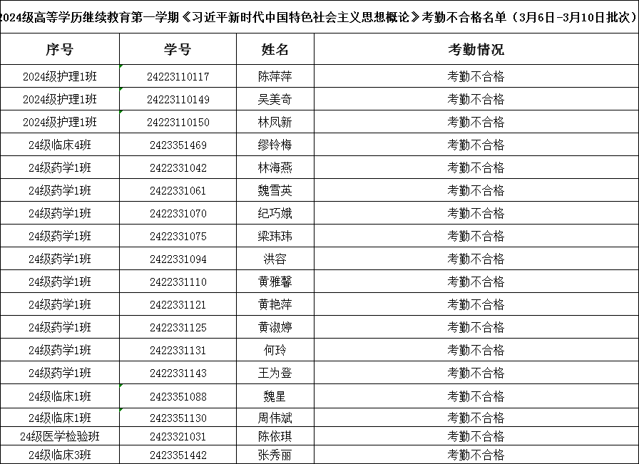 關(guān)于2024級3月6-10日返校面授《習(xí)近平新時代中國特色社會主義思想概論》課程上課考勤不合格名單的通報