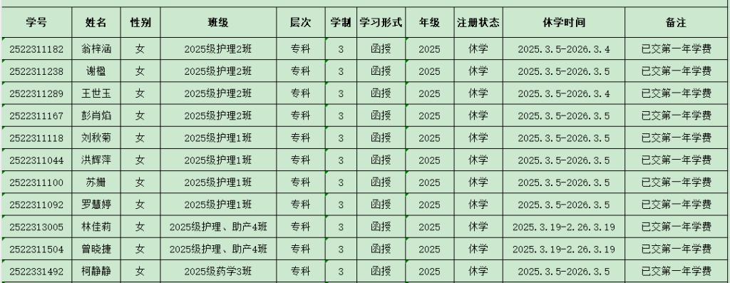 翁梓涵、謝楹等11名高等學歷繼續(xù)教育學生因哺乳期反復發(fā)熱等原因,申請休學。根據(jù)《福建衛(wèi)生職業(yè)技術(shù)學院高等學歷繼續(xù)教育學生學籍管理規(guī)定》(閩衛(wèi)院繼〔2025〕2號文)第六章第三十四條的有關(guān)規(guī)定,經(jīng)研究,擬同意翁梓涵、謝楹等11名高等學歷繼續(xù)教育學生休學,按照流程辦理。