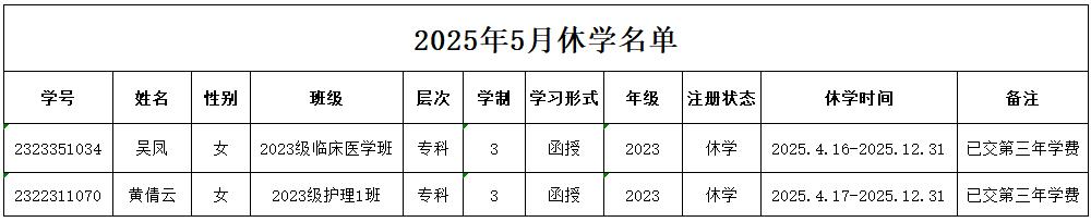 關(guān)于高等學(xué)歷繼續(xù)教育學(xué)生吳鳳、黃倩云等2名學(xué)生休學(xué)的公示