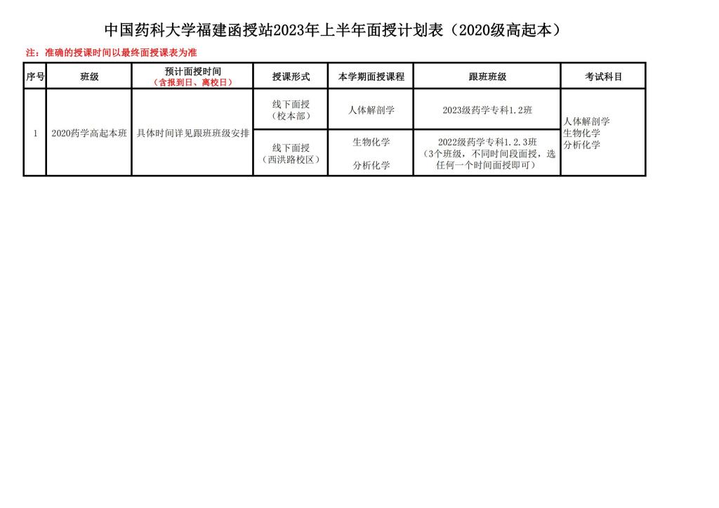 中國藥科大學(xué)福建函授站2023年上半年面授計劃表(2020級高起本)