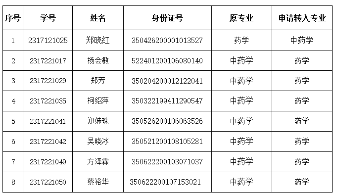 根據(jù)中國藥科大學(xué)繼續(xù)教育學(xué)院相關(guān)管理規(guī)定,2023級鄭曉紅等8人因個人工作需要等原因,提出轉(zhuǎn)專業(yè)申請,經(jīng)班主任審核,我站研究審議,該3名學(xué)生符合轉(zhuǎn)專業(yè)條件,同意轉(zhuǎn)專業(yè),并上報中國藥科大學(xué)繼續(xù)教育學(xué)院審批。 現(xiàn)將轉(zhuǎn)專業(yè)名單予以公示,公示期1月8日至1月12日,如有異議,請以書面形式在公示期內(nèi)向我站反饋。聯(lián)系電話:0591-22869959