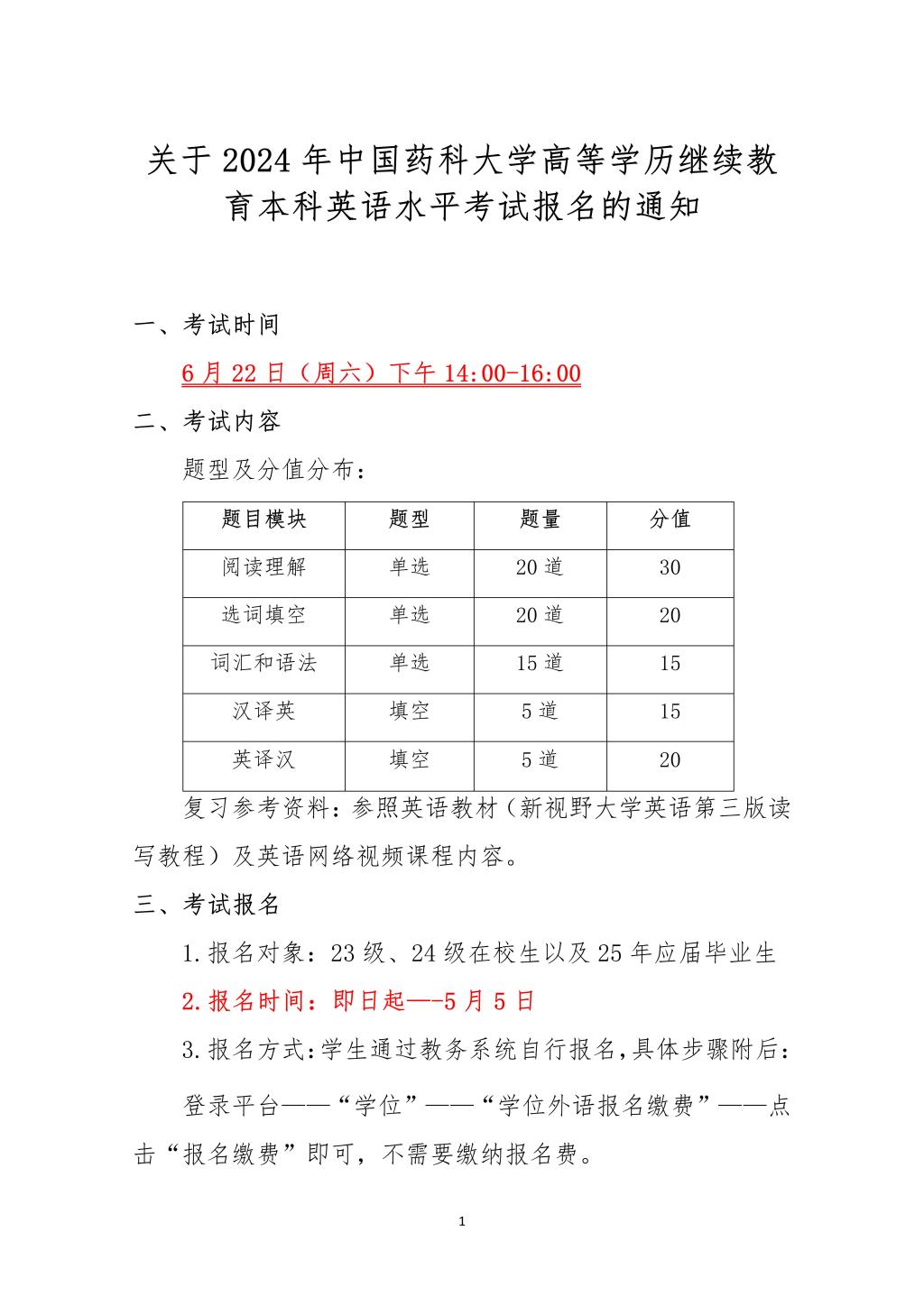 關于2024年中國藥科大學高等學歷繼續(xù)教育本科英語水平考試報名的通知
