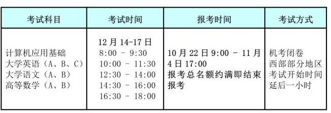 (1)《計(jì)算機(jī)應(yīng)用基礎(chǔ)》、《大學(xué)英語》B兩門統(tǒng)考課程全部采用混編考場方式。報(bào)考時(shí)間如下: