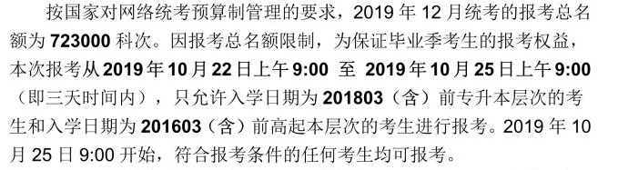 (2)2019年9月統(tǒng)考跨省報(bào)考的申請(qǐng)信息請(qǐng)于2019年10月10日前報(bào)學(xué)習(xí)中心。過期不予受理。