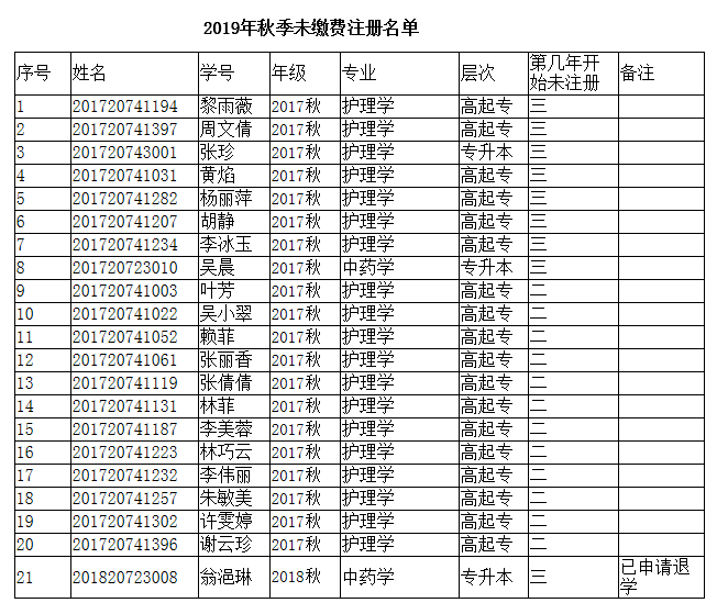 2018年9月開始,北京中醫(yī)藥大學(xué)遠(yuǎn)程教育學(xué)院學(xué)生學(xué)費(fèi)均在北中醫(yī)遠(yuǎn)程教育學(xué)習(xí)平臺(tái)上http://www.ibucm.com用支付寶掃描二維碼繳費(fèi), 截止2019年9月20日,2019年秋季學(xué)費(fèi)繳納已截止,以下學(xué)生未按規(guī)定繳費(fèi)注冊。請以下同學(xué)及時(shí)跟學(xué)習(xí)中心聯(lián)系,及時(shí)辦理請假、休學(xué)或者退學(xué)手續(xù)。(《退學(xué)申請表》、《復(fù)學(xué)申請表》詳見附件。