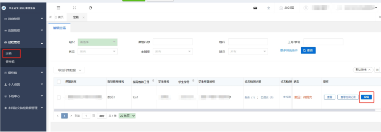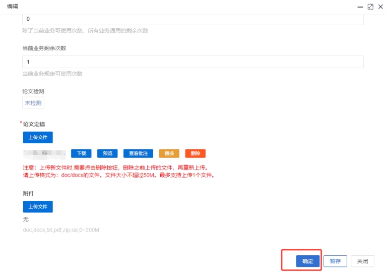 方式二:在點(diǎn)擊左側(cè)“過程管理”-“定稿”,點(diǎn)擊“編輯”,上傳論文。上傳完成后點(diǎn)擊“確定”完成提交。