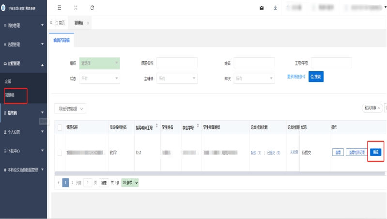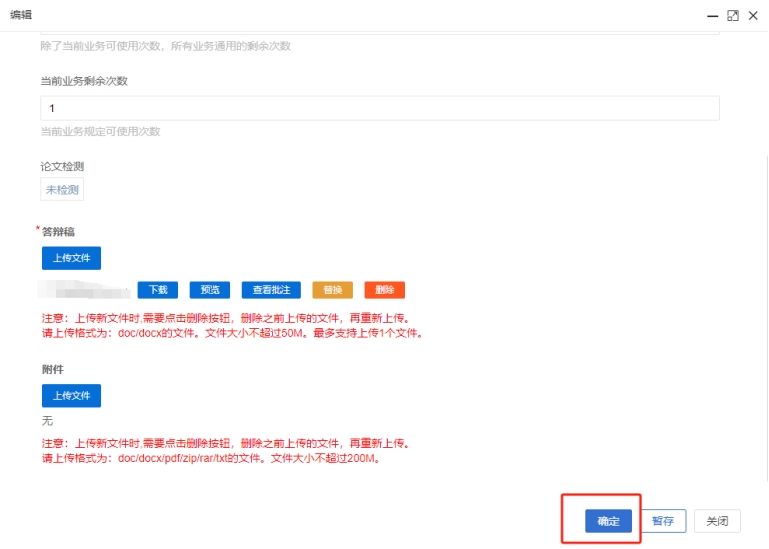 方式二:在點(diǎn)擊左側(cè)“過程管理”-“答辯稿”,點(diǎn)擊“編輯”,上傳論文。上傳完成后點(diǎn)擊“確定”完成提交。