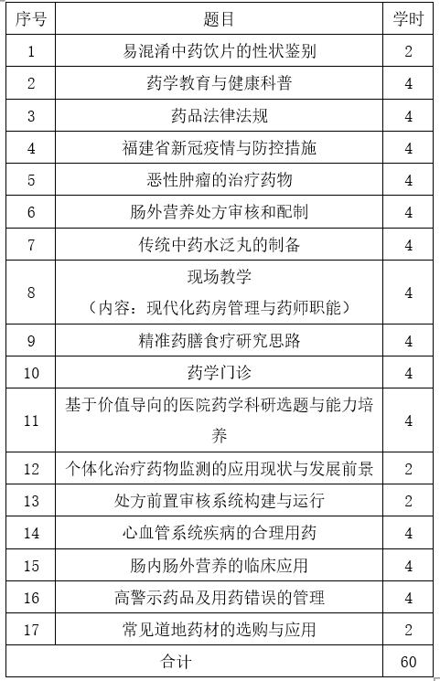 (1)內(nèi)容:根據(jù)《福建省藥師協(xié)會(huì)執(zhí)業(yè)藥師繼續(xù)教育2022-2023年專(zhuān)業(yè)科目綱要(試行)》文件,具體課程內(nèi)容詳見(jiàn)附件1。