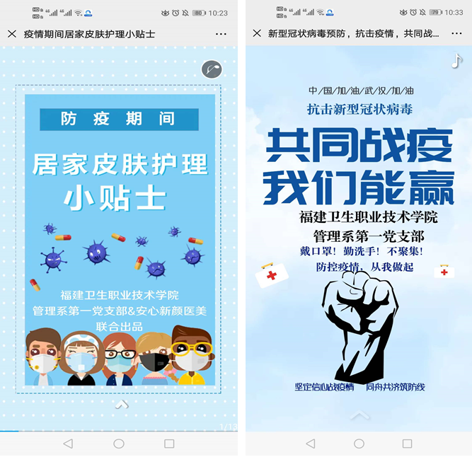 依托預防醫(yī)學教研室,利用專業(yè)優(yōu)勢,管理系第一黨支部在學院“天使之城”搭建抗擊新型冠狀病毒肺炎的線上課程資源——《新型冠狀病毒的個人防護與學校衛(wèi)生》,拍攝《戰(zhàn)疫我先行——閩衛(wèi)院開學“疫戰(zhàn)”第一課》,通過實時更新疫情動態(tài),傳授公共衛(wèi)生與安全知識,提高學生疫情防控能力。組織學習防疫阻擊戰(zhàn)中涌現的先進事跡,弘揚社會美德,增強學生愛黨愛國愛人民愛社會主義的思想情感,將課程思政融入到疫情防控的每一個落腳點。