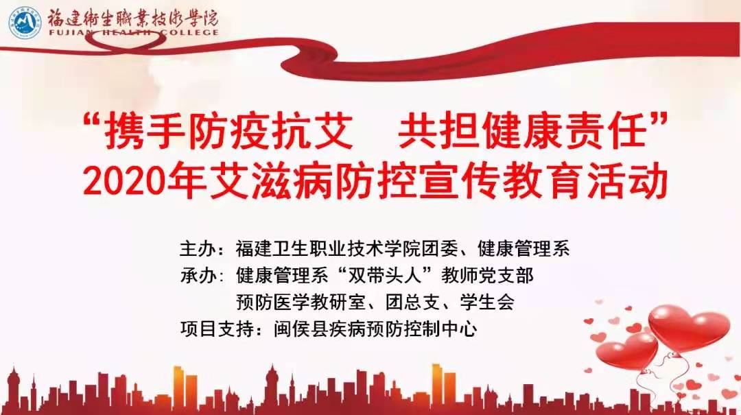 2020年11月12日,在第33個“世界艾滋病日”來臨之際,為進一步宣傳普及艾滋病防治知識,由校團委、健康管理系主辦的“攜手防疫抗艾,共擔(dān)健康責(zé)任”防艾宣傳教育活動啟動儀式在實訓(xùn)樓報告廳舉行,院長許能鋒、副院長黃銘珊、福建省疾控中心副主任醫(yī)師夏品蒼、閩侯縣疾控中心副主任陳曉燕出席,校團委、學(xué)工部、各二級院系黨團總支負責(zé)人、師生代表700多名在主會場和5個分會場參加活動。