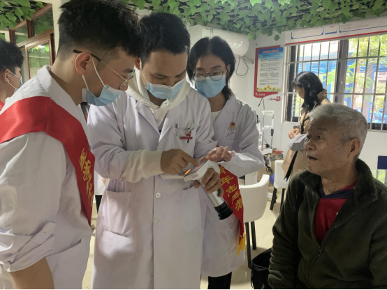 眼部疾病檢查,愛(ài)眼護(hù)眼在行動(dòng)。眼視光技術(shù)專(zhuān)業(yè)的師生攜帶裂隙燈顯微鏡、非接觸性眼壓計(jì)、眼底照相機(jī)等專(zhuān)業(yè)設(shè)備,為社區(qū)居民開(kāi)展眼部健康、眼前節(jié)及眼底等檢查,篩查年齡相關(guān)性白內(nèi)障和糖尿病視網(wǎng)膜病變。對(duì)義診中篩查出的眼部健康問(wèn)題,師生們耐心指導(dǎo)社區(qū)居民愛(ài)眼護(hù)眼的方法,引導(dǎo)特殊情況及時(shí)就醫(yī)。