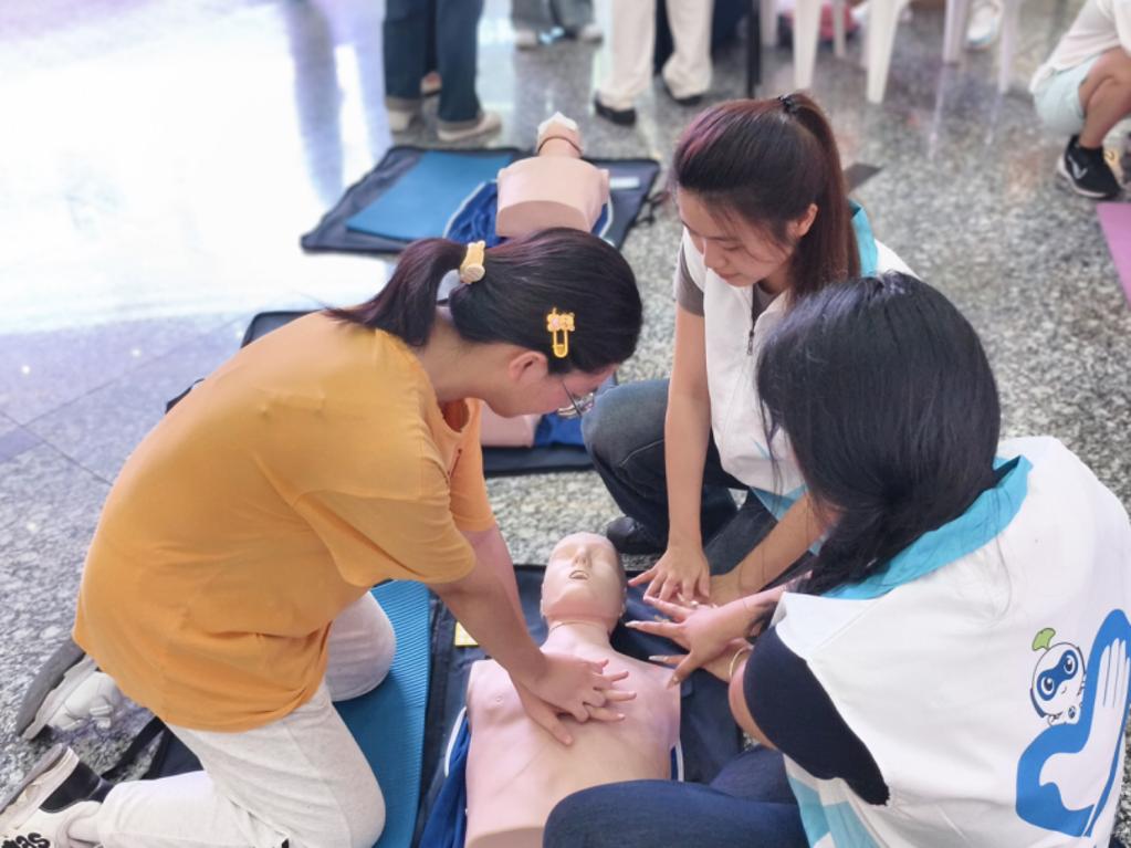 生命守護(hù)急救站里,健康管理組師生現(xiàn)場(chǎng)演示心肺復(fù)蘇與海姆立克急救法,市民們輪番上陣實(shí)操,志愿者手把手糾正動(dòng)作細(xì)節(jié)。