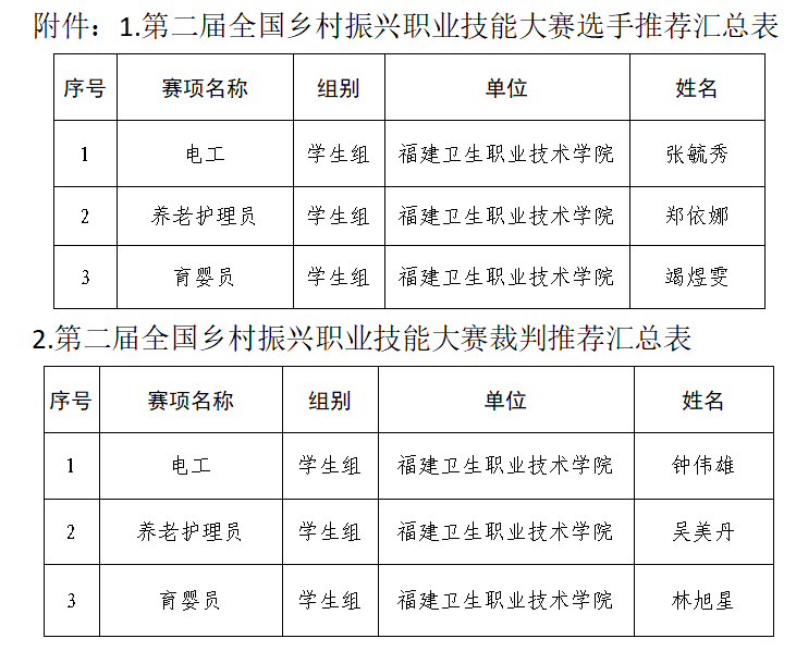 根據(jù)《福建省人力資源和社會(huì)保障廳關(guān)于做好第二屆全國(guó)鄉(xiāng)村振興職業(yè)技能大賽參賽報(bào)名工作的通知》要求,經(jīng)二級(jí)學(xué)院推薦,繼續(xù)教育學(xué)院審核,擬推薦以下學(xué)生和老師報(bào)名第二屆全國(guó)鄉(xiāng)村振興職業(yè)技能大賽參賽選手和裁判員。