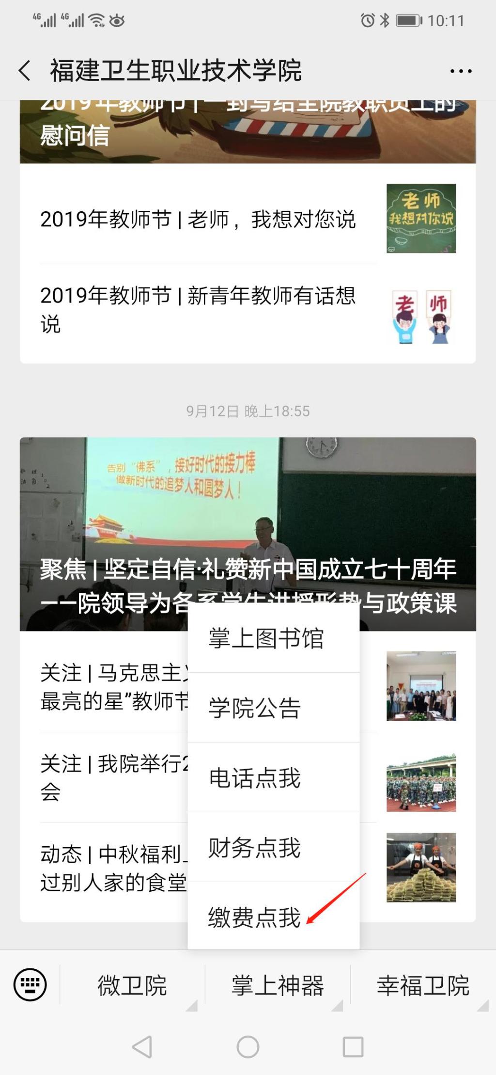 步驟1 關(guān)注“福建衛(wèi)生職業(yè)技術(shù)學(xué)院”微信公眾號后,點擊下方“掌上神器”后再點擊“繳費點我”。