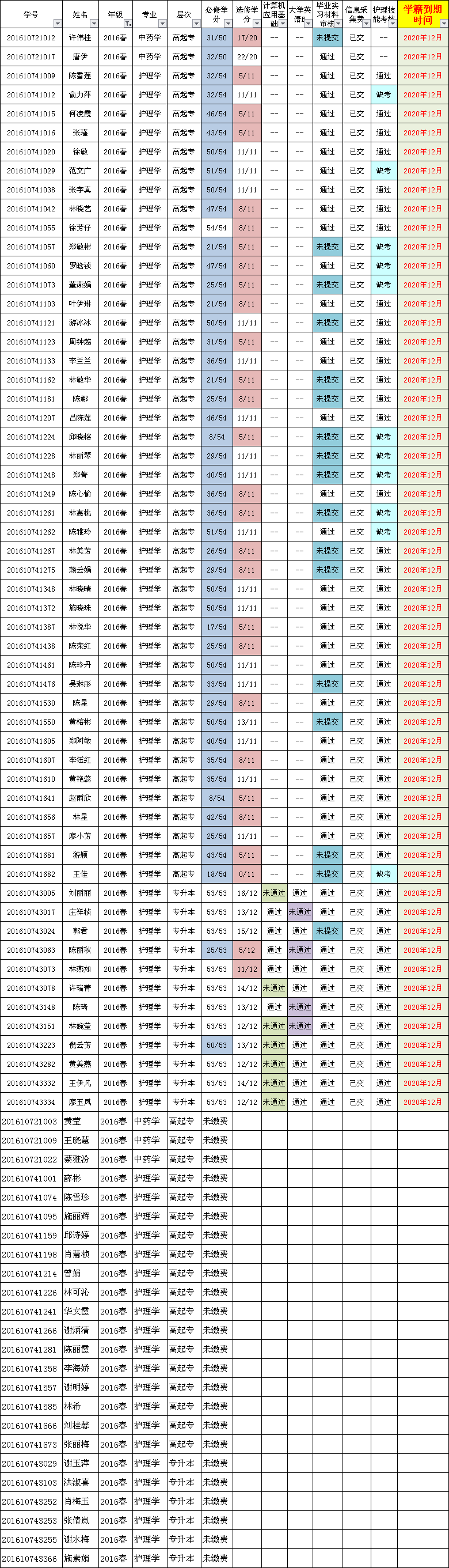 經(jīng)審核,截止2020年12月,2016春部分學(xué)生(見(jiàn)附件)還未達(dá)到畢業(yè)條件,主要有以下幾種情況: