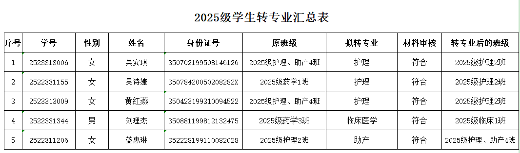 根據(jù)《福建衛(wèi)生職業(yè)技術(shù)學(xué)院高等學(xué)歷繼續(xù)教育學(xué)生學(xué)籍管理規(guī)定》(閩衛(wèi)院繼〔2025〕2號文)第五章第二十九條的有關(guān)規(guī)定,我院高等學(xué)歷繼續(xù)教育2025級學(xué)生吳安琪等5人因工作需要等原因,提出轉(zhuǎn)專業(yè)申請,經(jīng)班主任審核,學(xué)院研究審議,該5名學(xué)生符合轉(zhuǎn)專業(yè)條件,同意轉(zhuǎn)入相關(guān)專業(yè)學(xué)習(xí)。