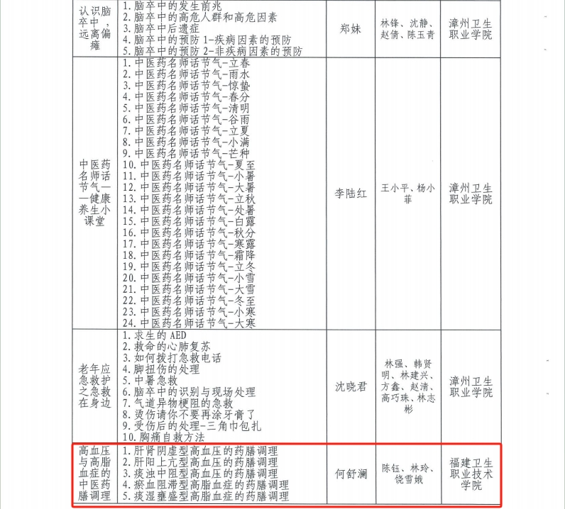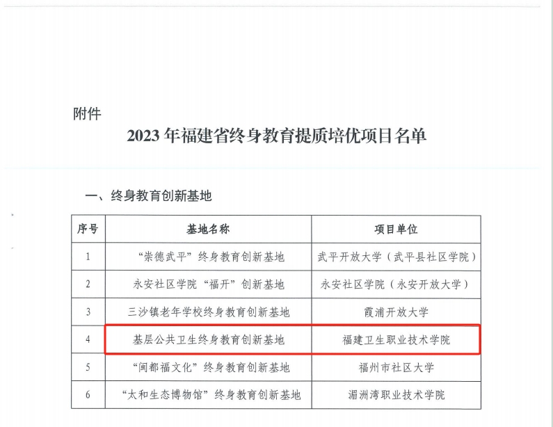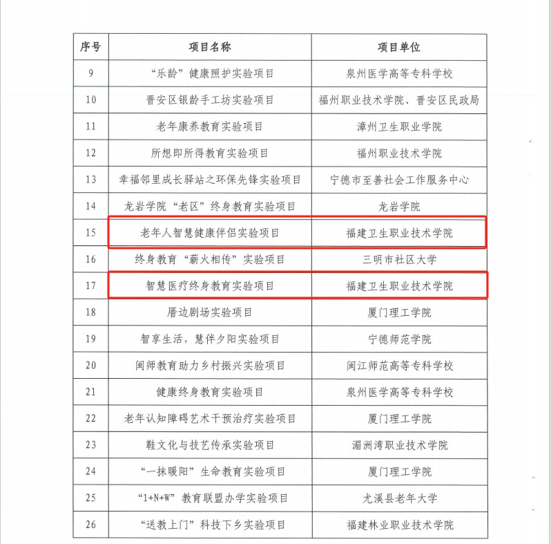 近日,福建省終身教育促進(jìn)委員會公布了2023年福建省終身教育提質(zhì)培優(yōu)項(xiàng)目,我校前期申報(bào)的4個(gè)項(xiàng)目成功入選,其中健康管理系陳愛珍老師申報(bào)的《基層公共衛(wèi)生終身教育創(chuàng)新基地》入選終身教育創(chuàng)新基地;醫(yī)學(xué)院林國威老師申報(bào)的《老年人智慧健康伴侶實(shí)驗(yàn)項(xiàng)目》、醫(yī)學(xué)技術(shù)系鐘偉雄老師申報(bào)的《智慧醫(yī)療終身教育實(shí)驗(yàn)項(xiàng)目》入選終身教育實(shí)驗(yàn)項(xiàng)目;教務(wù)處何舒瀾老師申報(bào)的《高血壓與高脂血癥的中醫(yī)藥膳調(diào)理》入選社區(qū)(老年)教育課程資源。