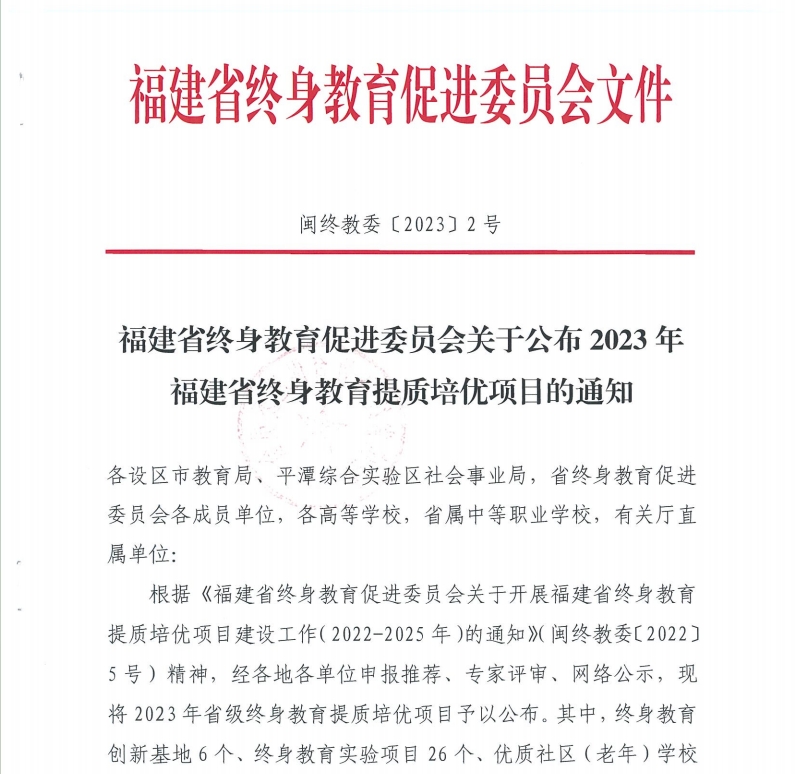 福建省終身教育提質(zhì)培優(yōu)項(xiàng)目是福建省貫徹中共中央、國務(wù)院《關(guān)于加強(qiáng)新時(shí)代老齡工作的意見》的重大舉措,旨在多渠道擴(kuò)大社區(qū)教育、老年教育資源供給,完善我省終身教育服務(wù)體系,打造具有福建特色的終身教育發(fā)展模式,助力“構(gòu)建服務(wù)全民終身學(xué)習(xí)的教育體系”。經(jīng)各地各單位申報(bào)推薦、專家評審、網(wǎng)絡(luò)公示,2023年福建省終身教育提質(zhì)培優(yōu)項(xiàng)目共入選終身教育創(chuàng)新基地6個(gè)、終身教育實(shí)驗(yàn)項(xiàng)目26個(gè)、優(yōu)質(zhì)社區(qū)(老年)學(xué)校(學(xué)習(xí)中心)18個(gè)、社區(qū)(老年)教育鄉(xiāng)土教材13冊、社區(qū)(老年)教育課程資源25門339講、高校老年大學(xué)4所、學(xué)習(xí)型社區(qū)(村)22個(gè)、終身教育重點(diǎn)研究課題立項(xiàng)3個(gè)、終身教育一般研究課題立項(xiàng)47個(gè)。