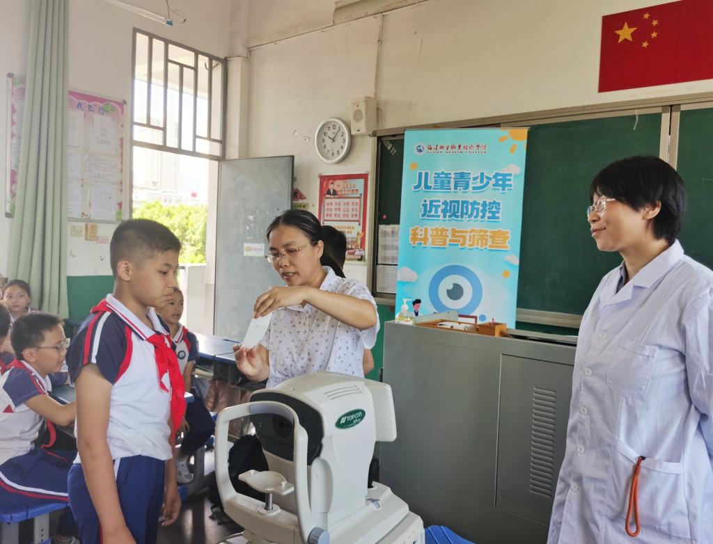 醫(yī)工學(xué)院的王珊珊教授則帶領(lǐng)眼視光專業(yè)老師為孩子們進行近視篩查。老師們攜帶專業(yè)設(shè)備,逐一為孩子們進行驗光,并向每個孩子耐心講解驗光結(jié)果,告訴他們良好的視力對于提高學(xué)習(xí)效率至關(guān)重要,呼吁家長和孩子們重視青少年近視問題,做到早預(yù)防、早發(fā)現(xiàn)、早干預(yù)。