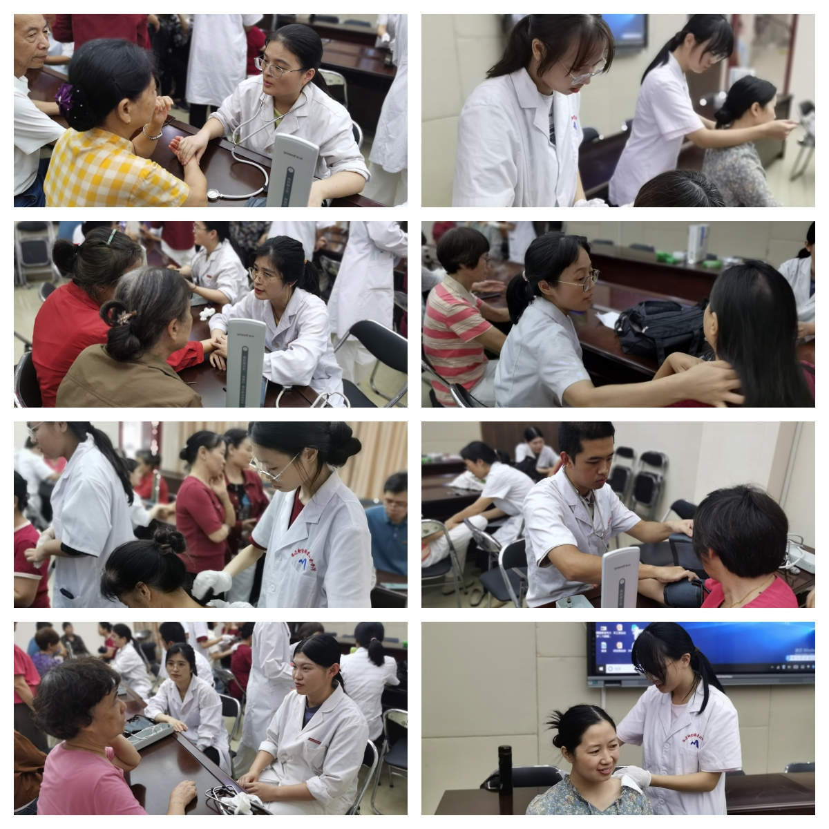 醫(yī)學院教師第三黨支部的師生們還為學員們提供了艾灸刮痧、保健推拿、血壓防控、把脈問診等一系列義診服務(wù)。這些貼心的服務(wù)深受學員們的喜愛,現(xiàn)場人頭攢動,絡(luò)繹不絕。